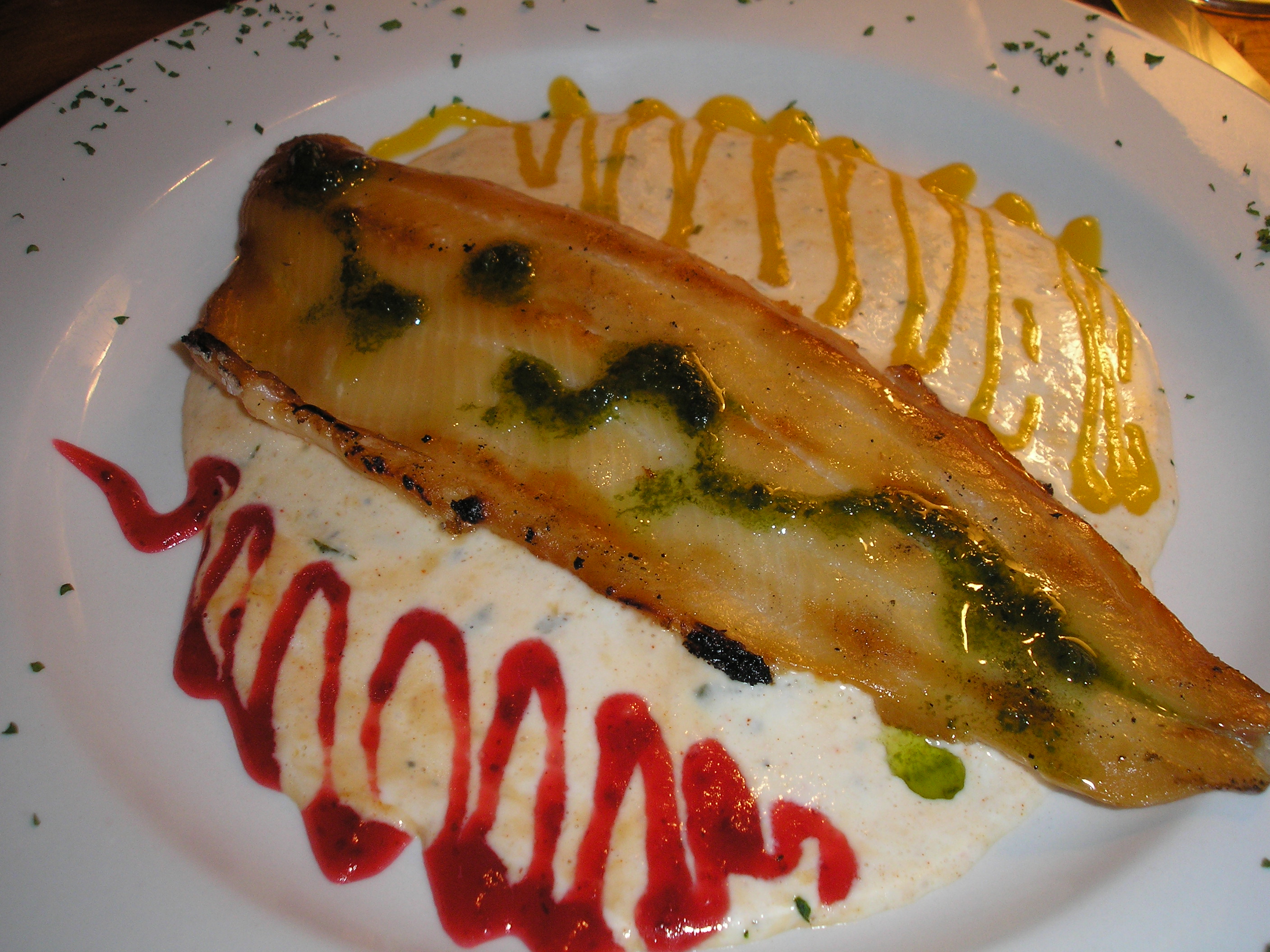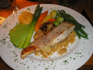 The smoked trout appetizer was much bigger and more complex than we expected. The menu description of horseradish cream sauce didn’t disclose the delightful additions of fruity elements that we think were raspberry and orange. As for the fish itself, the unusual strategy of hot rather than cold presentation did a fine job in bringing out the flavor.